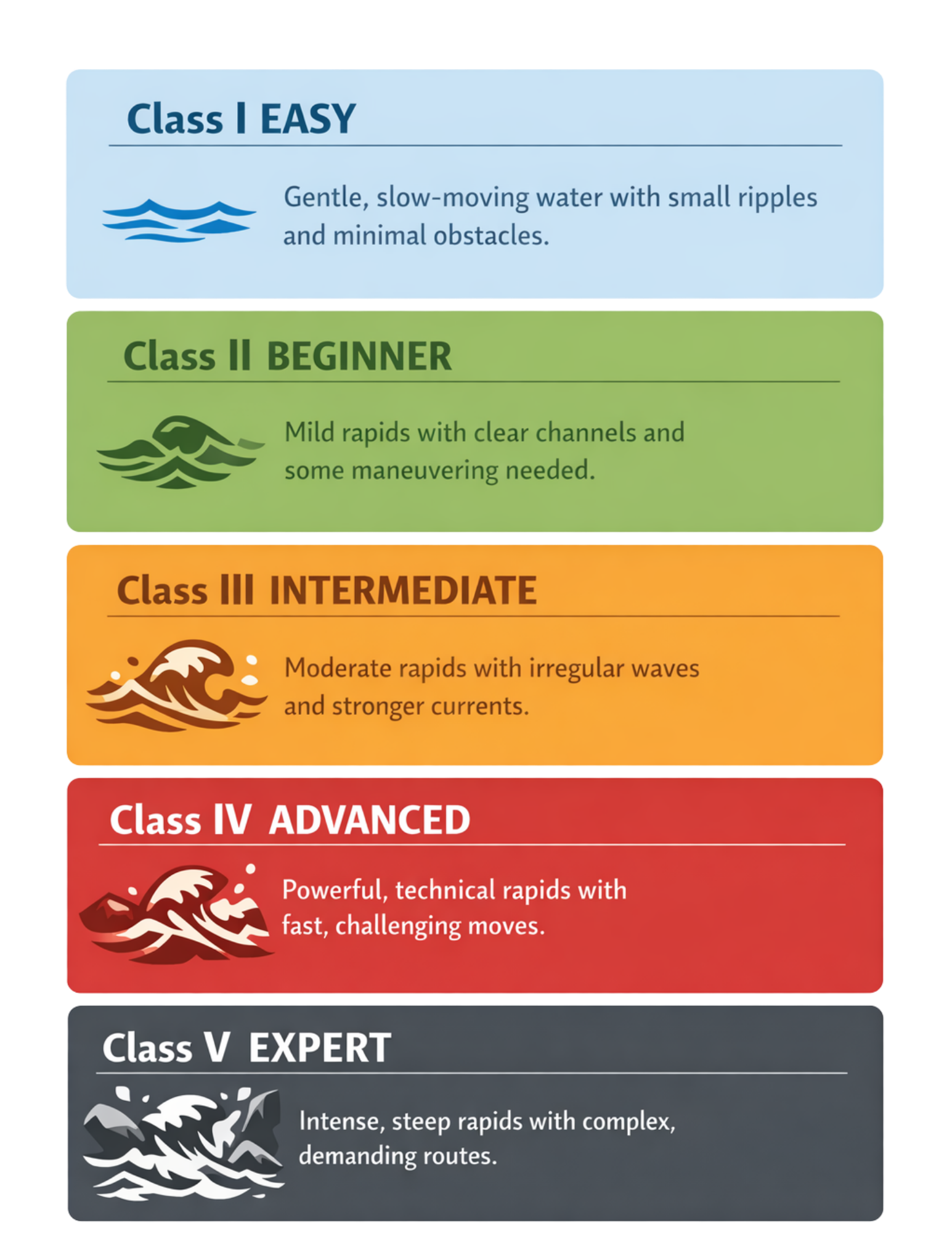 Powerful, technical rapids with large waves, fast-moving current, and precise maneuvering through tighter channels. Strong paddling and quick response are essential.
